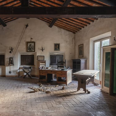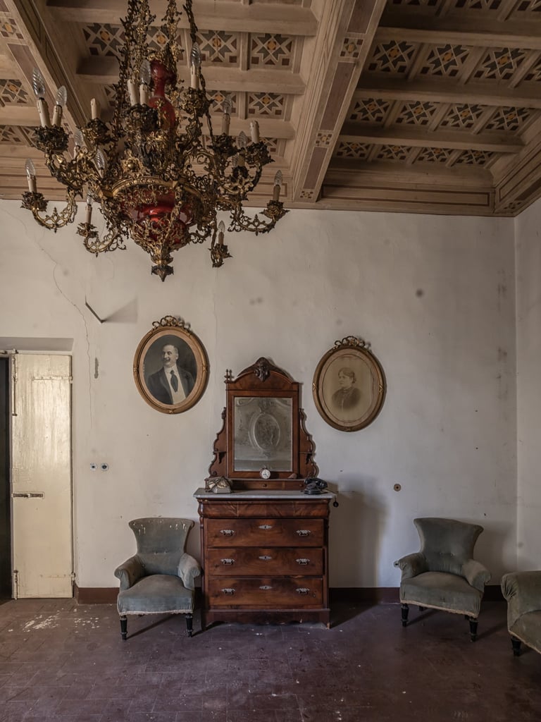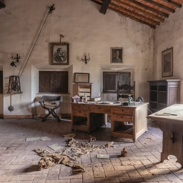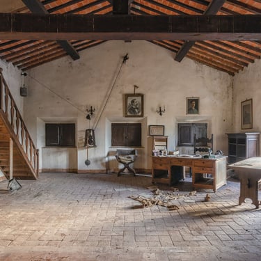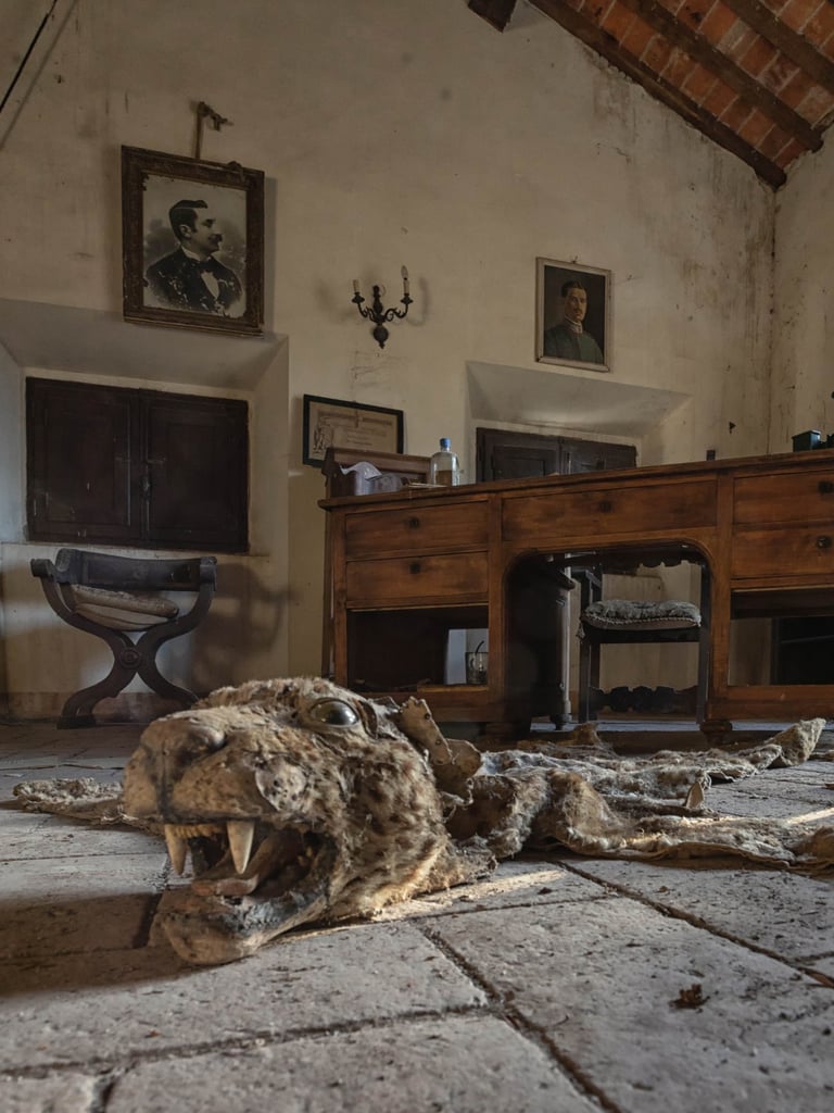 A differenza di molte altre ville, qua il sottotetto è decisamente alto e spazioso. Le travi del soffitto sono imponenti. In un angolo si trova una scrivania con vecchi timbri, inchiostro e un telefono vintage. Alle pareti dei quadri logori raffiguranti vecchi padroni di casa, uno di essi pare in uniforme. Rovistando nei vari armadi, rimango esterrefatto scoprendo un tappeto in vera pella di giaguaro. Decido di stenderlo davanti alla scrivania. Chiedo venia. Arredare un luogo abbandonato non è il massimo, ma trovare un tesoro del genere e non sfruttarlo per un set fotografico è uno spreco notevole.