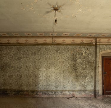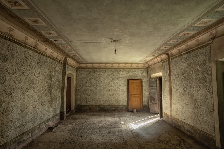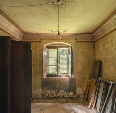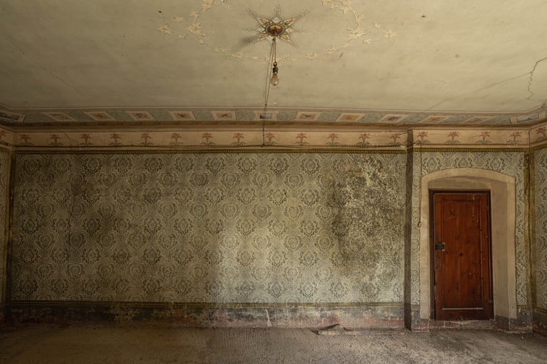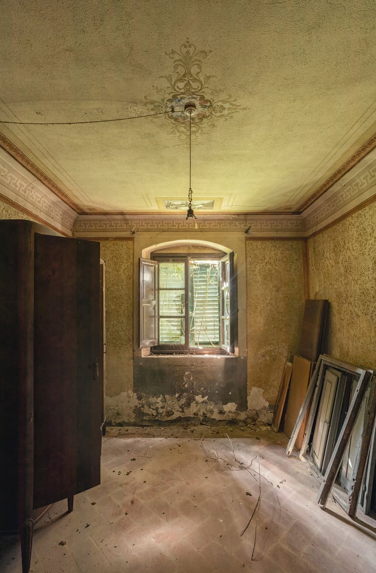 Una stanza al piano di sopra è decorata a motivi floreali, con piccoli affreschi di animali e paesaggi che si susseguono. Il pavimento è instabile, logorato da decenni di abbandono.