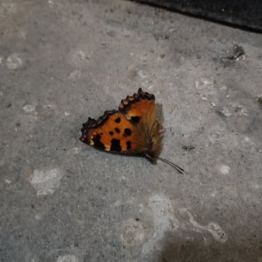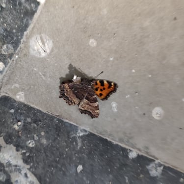 Uno dei momenti più belli dell'esplorazione è perdersi nei dettagli, per cogliere quelle piccole sensazioni che appagano la soddisfazione di un esploratore. Ed è proprio camminando verso l'altare che noto un dettaglio molto strano, in prossimità dell'ossario giacciono alcune farfalle senza vita. Pare che siano morte da poco tempo, spiccano decisamente tra polvere e guano, forse sono entrate dentro alla chiesa e non sono più riuscite ad uscire. O forse, dopo i giorni passati a svolazzare là fuori, è nel silenzio dell'abbandono che vengono a morire.