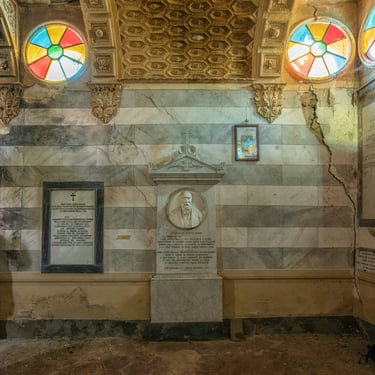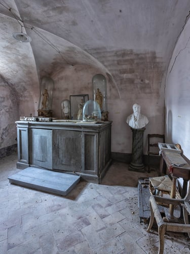 Scostando leggermente la tenda rossa dietro l'altare si arriva in una piccola sagrestia. Un busto in marmo mi accoglie poggiato su di una colonna. Lo stesso volto raffigurato sulla parete della cappella, sicuramente uno degli esponenti più importanti della famiglia, deceduto a fine 800. Insieme ad alcune statue ornamentali, c'è anche un piccolo busto, posto sotto ad una campana di vetro, raffigurante un bambino, probabilmente anche lui sepolto in questa struttura sacra. Al centro della stanza c'è un mobile, al cui interno ci sono vecchi oggetti impolverati per celebrare funzioni religiose.