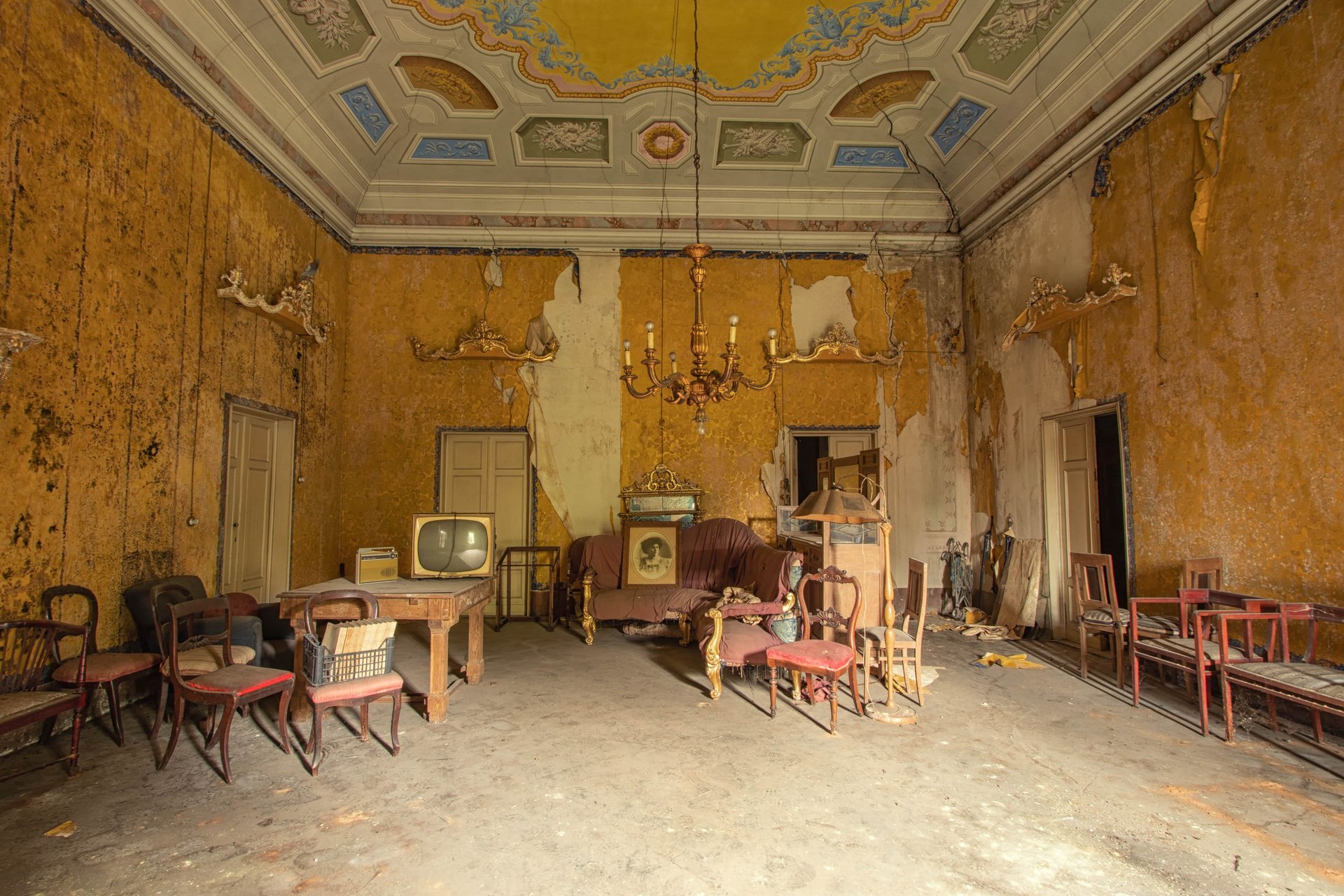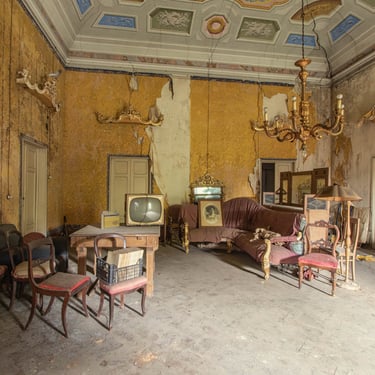 Un'altra grande sala, stavolta dorata e più fatiscente. Lo stile degli arredi è il solito ma caotico, ci sono sedie, tavoli ed un divano messi senza un'apparente senso. Ci tengo a precisare che in ogni stanza di questa dimora, nessun oggetto è stato spostato per comporre un arredamento, ciò che vedete è esattamente com'è stato posizionato dai proprietari. Un meraviglioso televisore vintage, una radio d'epoca, una logora lampada da terra. Tutti oggetti che portano con sé il peso degli anni. Sul divano un quadro che ritrae Elvira Bonturi, moglie del compositore lucchese Giacomo Puccini. La carta da parati strappata crea la solita pazzesca atmosfera, tanto cara agli esploratori urbani. Mentre ero intento a scattare, un simpatico piccione ha svolazzato per tutta la stanza , il risultato lo vedete guardando sulla sinistra, sopra la porta.