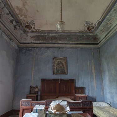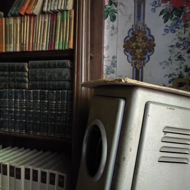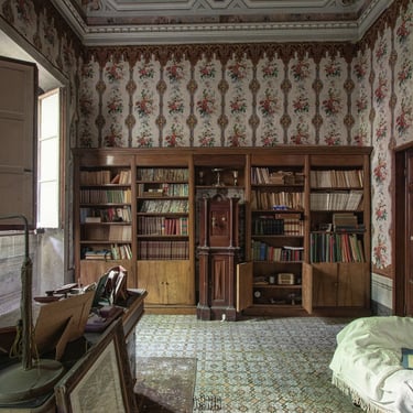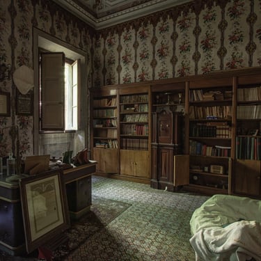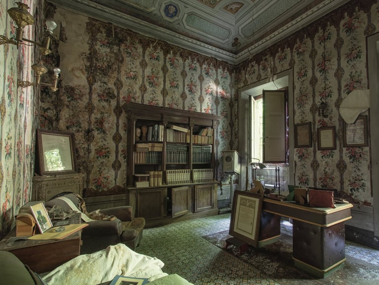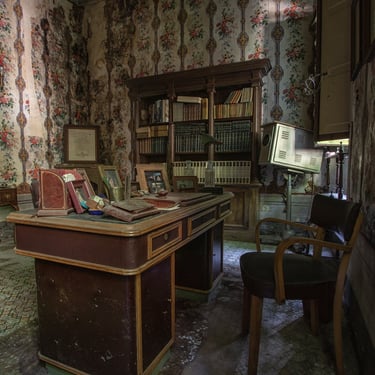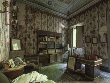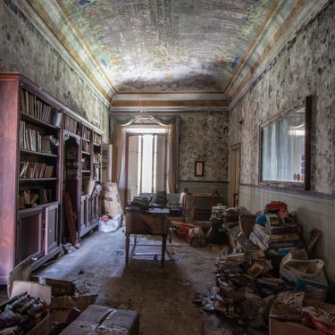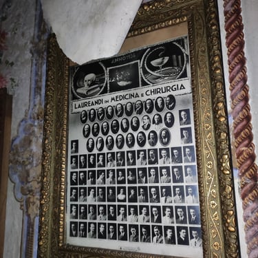 Adesso è arrivato il momento di mostrare il cuore di questa dimora, ovvero lo studio, la parte alla quale rimango più affezionato. Tramandato di padre in figlio, questo ambiente è stato il centro nevralgico della vita economica di questa famiglia. I quadri alle pareti mostrano una laurea in medicina e chirurgia, datata 1936 e firmata da Vittorio Emanuele III a Roma. La biblioteca è piena di tomi di medicina e di arte. Una bellissima cassaforte è posizionata al centro delle librerie. Al di sopra alcuni trofei. La quantità di oggetti personali è veramente impressionante. Ci sono documenti, patenti ed una marea di foto. Tra quest'ultime mi colpisce in particolar modo una scena dolcissima, il padrone di casa che tiene in braccio un bambino un po imbronciato. L'atmosfera che si respira in questo ambiente è inevitabilmente triste, poiché mi trovo a dover fare i conti con la realtà dei fatti, un palazzo incantevole che sta cadendo nell'oblio, insieme a tutti i suoi oggetti che raccontano vite intere. Esplorando questo studio, mi sento quasi osservato, percepisco una strana energia, difficile per una persona come me, solitamente fredda e distaccata, poco incline a certe sensazioni paranormali. Non riesco a descrivere ciò che ho provato ma sono fiducioso che qualche lettore comprenderà. Sento il dovere di essere più rispettoso possibile. Osservo meravigliato il proiettore professionale che si trova alla destra della scrivania. Insieme ad alcune targhe ritrovate nei cassetti, dimostrano che il proprietario fosse un appassionato cinefilo. Ma non solo un hobby, visto che aveva in suo possesso alcuni cinema ed il teatro della cittadina. Una famiglia che ha avuto una certa rilevanza locale.