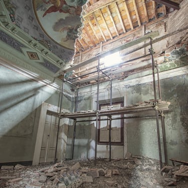 La luce del sole filtra direttamente dal tetto crollato. Mi muovo lentamente e soltanto ai margini, troppo pericoloso arrivare al centro. Il cassettone sembra che stia per cedere da un momento all'altro. La situazione è decisamente pericolante.