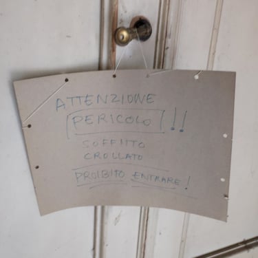 Anche il resto del piano non è il massimo della stabilità, alcune delle stanze che vi mostrerò in questo articolo, ad oggi hanno subito gravi danni. Alcuni esempi sono la stanza ricolma di giochi, il bagno crollato visto quando ero ancora nel giardino ed un chiaro ed esplicito cartello appeso alla maniglia di una porta.