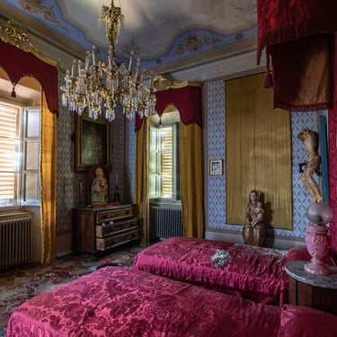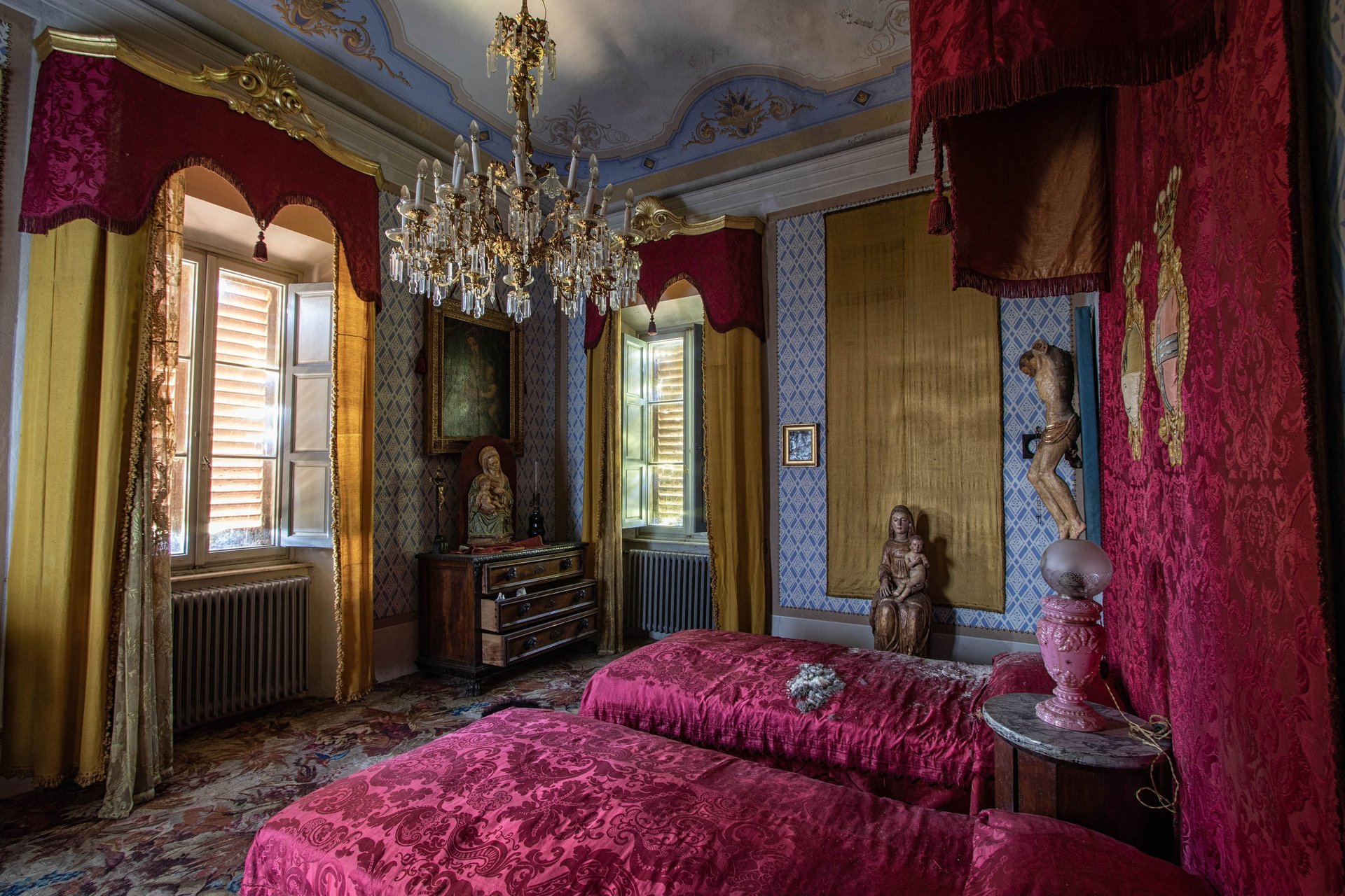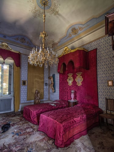Il rosso cremisi dei due letti a baldacchino colpisce direttamente le mie retine e mi fa spalancare gli occhi, un'immagine vivida che conservo ancora oggi. Il tessuto damascato, insieme ai due bellissimi stemmi araldici, indicano nuovamente la potenza e l'antichità della famiglia che ha governato questo palazzo. Il pavimento è coperto da un tappeto a motivi floreali, sopra al quale i miei scarponi stonano decisamente. Un pò di intonaco è caduto su di un letto, ma la stanza è abbastanza intonsa, nonostante un forte odore di muffa e di chiuso. Statue religiose sono sparse per la stanza. ad essere onesto, mi sarei trovato un pò a disagio a dormire in mezzo a tutti questi cimeli cattolici. Il cristo crocifisso, senza braccia, fa un discreto impatto alla vista. La famiglia che ha eretto questo palazzo doveva essere molto devota, alcuni membri avevano ruoli importanti nella curia cattolica. Lo dimostra il quadro con l'albero genealogico che per ovvi motivi non vi posso mostrare.