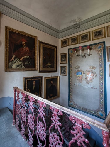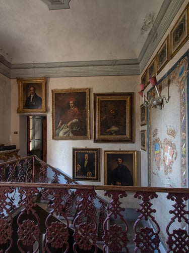 Il palazzo è ben protetto da un alto muro di cinta, per cui bisogna essere sul posto ad un orario indecente. Il giardino è trasandato, incolto, si notano gli arbusti secchi della scorsa estate. Al momento pare che nessuno si stia prendendo cura di questo luogo, molto probabilmente è una situazione temporanea dovuta a chissà quale problematica. Fatto sta che il palazzo è accessibile e non perdo l'occasione di ficcarci il naso dentro assieme alla mia attrezzatura fotografica. Ricordo ancora in modo vivido la prima immagine, una scalinata con le pareti completamente tappezzate di ritratti antichi e due stemmi di famiglia con il motto "Sanguine et Virtute".