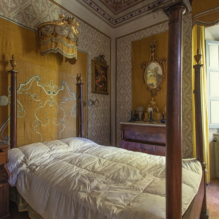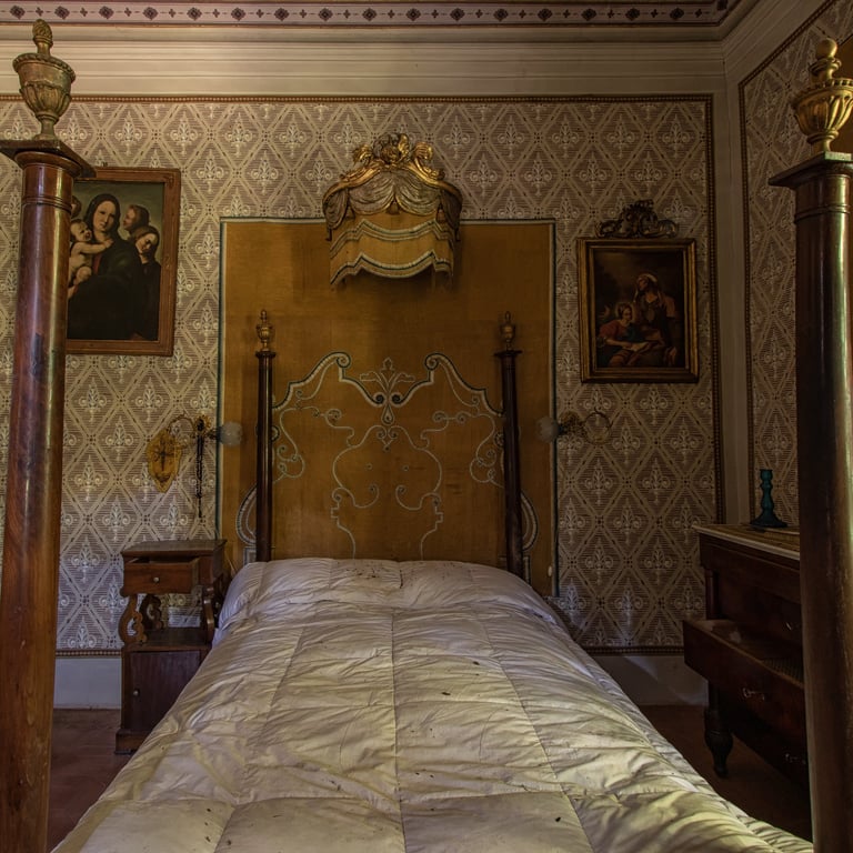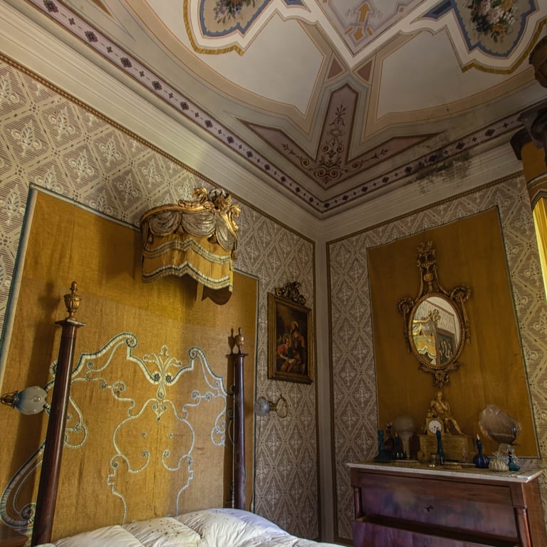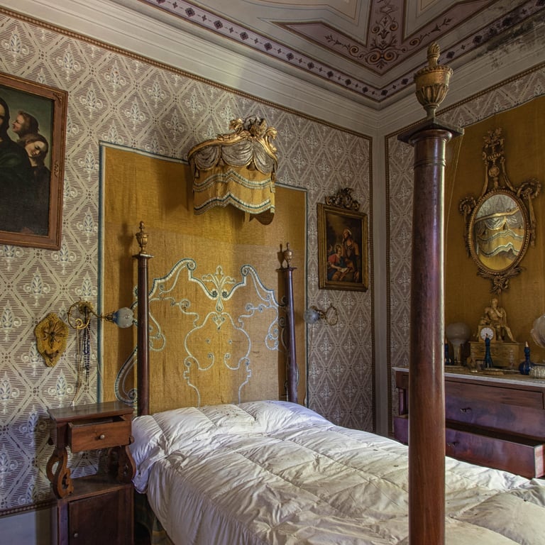 Il riflesso nello specchio non è altro che un magnifico baldacchino fissato alla parete, sotto al quale c'è un tessuto damascato che fa da ulteriore ornamento. A rendere il tutto ancora più opulento, ci sono 4 urne, nuovamente dorate, in cima a delle colonne in legno. Il lusso di questa stanza è quasi stucchevole, esagerato. Il soffitto è decorato con motivi geometrici e floreali. Alle pareti ci sono quadri religiosi, mentre un rosario penzola da una bajour. Un orologio sveglia raffigurante un condottiero romano posizionato sulla cassettiera. La stanza è piccola ma scoppia di dettagli di notevole pregio.