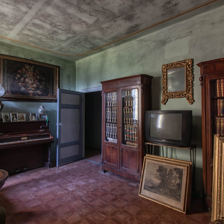 Gli ambienti sono sfarzosi ed alcune stanze sono utilizzate come deposito, nonostante abbiano arredi notevoli. Un sottile velo di polvere ricopre il mobilio ma il pian terreno potrebbe essere immediatamente abitabile, anche se, gli anni in cui questa villa era abitata, risalgono a decadi fa. Non ci sono recenti segni di vita vissuta. Forse era visitabile su prenotazione, ma non ci sono tracce online. La famiglia doveva abitare nella depandance, chiusa e ristrutturata pochi anni fa.
