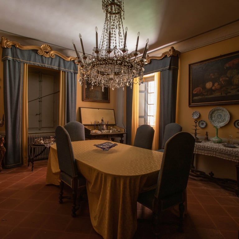 Il magnifico salone, dove contrastano il celeste della pareti e il dorato degli arredi, è sicuramente la stanza più interessante del pian terreno. Difficile descrivere tutti i dettagli che la compongono. Ci sono riferimenti napoleonici e ritratti di uno dei proprietari in tenuta militare. Su di un tavolo da fumo, una scacchiera, carte da gioco e tarocchi. Passando da una stanza all'altra, continuo a sentirmi osservato. Quadri di nobili, principesse e cardinali, tappezzano quasi ogni parete. La maggior parte sono di notevole pregio, olio su tela, non semplici stampe. Anche le bellissime urne in marmo nero, non passano di certo inosservate. Mentre gli occhi di tutti questi personaggi illustri mi lasciano un attimo di tregua, entro in quella che sembra essere una sala da pranzo. Un tavolo con una grande tovaglia, anch'essa dorata, si trova al centro di una stanza praticamente intonsa. Da notare un altro lampadario di rara bellezza.