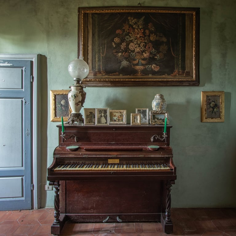 E' il momento di tornare al piano superiore e scoprire cosa mi attende. Salgo le scale, superando di nuovo una moltitudine di volti. Nella prima stanza mi accolgono due librerie colme di tomi ed un bellissimo pianoforte, su cui trovo delle foto di famiglia. Molte camere non sono fotografabili perchè piene di scatole e oggetti depositati un pò ovunque. Ma la parte migliore deve ancora venire, due camere da letto sono letteralmente da togliere il fiato, una in particolar modo.