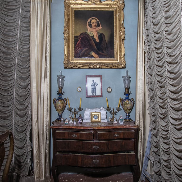 Un opulento palazzo di un'antica famiglia nobile del centro Italia. Drappi dorati e tessuti damascati. Un luogo sospeso in un tempo lontano, fatto di lussi, ritratti ad olio e cimeli religiosi.