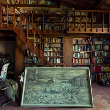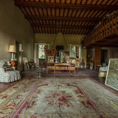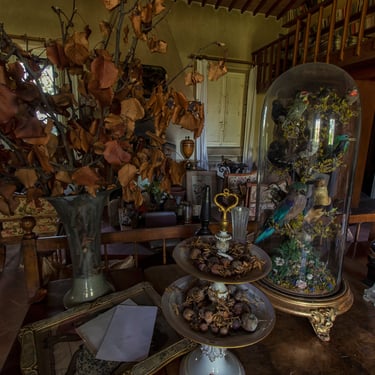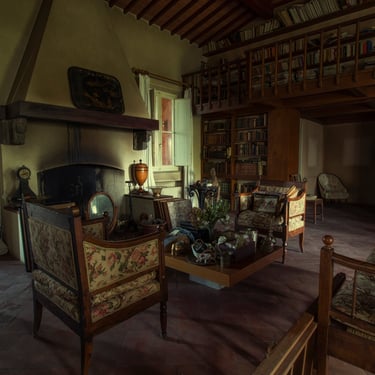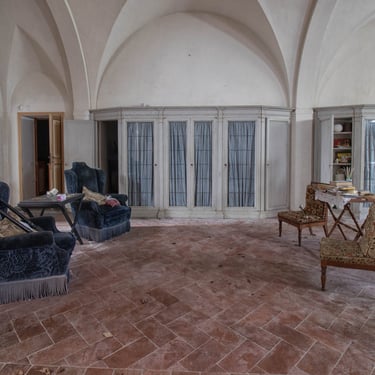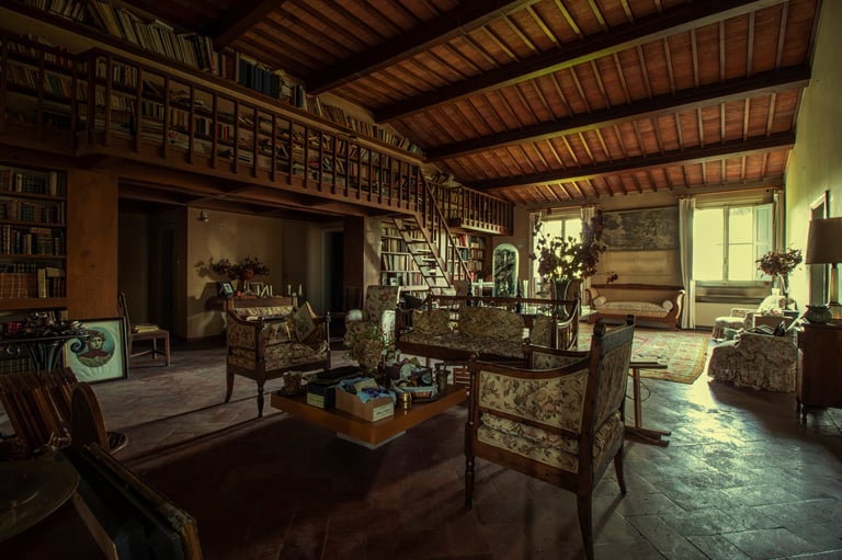 Si spalanca davanti a noi una sala completamente arredata. Una maestosa libreria ricopre quasi l'intera parete, c'è addirittura una scala in legno per arrivare alla parte superiore. Dal vivo vi assicuro che il soffitto è molto più alto di come sembra in foto. La struttura in origine doveva essere un classico rustico toscano. Travi in legno a vista, pavimento in cotto ed un grande camino. Ciò che colpisce di più è quanto sia intatto questo salone. Tranne alcuni quadri sparsi su sedie e poltrone, tutto è rimasto congelato nel tempo. Dai segni delle cornici rimasti alla parete, pare che il proprietario fosse intenzionato a smantellare tutto, o almeno ad incominciare a farlo. Lo stesso lo notiamo nelle stanze limitrofe, ci sono valigie piene, oggetti buttati alla rinfusa, arredi spariti, forse anche per opera di alcuni ladri entrati prima di noi. Fatto sta che l'unica stanza intonsa di questo piano, è il salone. Quasi ogni spazio della libreria è riempito dai libri, alcuni più recenti, altri risalenti addirittura al 19° secolo. Al colpo d'occhio è veramente maestosa. La chicca finale è una campana di vetro con all'interno numerosi uccelli impagliati. Un bellissimo diorama con specie prevalentemente di origine esotica. Girottolando tra le stanze, mi rendo conto che non ci sono scale che portano al pian terreno. Pare che i due piani siano divisi. Non fosse per un dettaglio che non ho mai rivisto in tutte le mie esplorazioni, ovvero un ascensore in un'abitazione privata. Decisamente insolito.